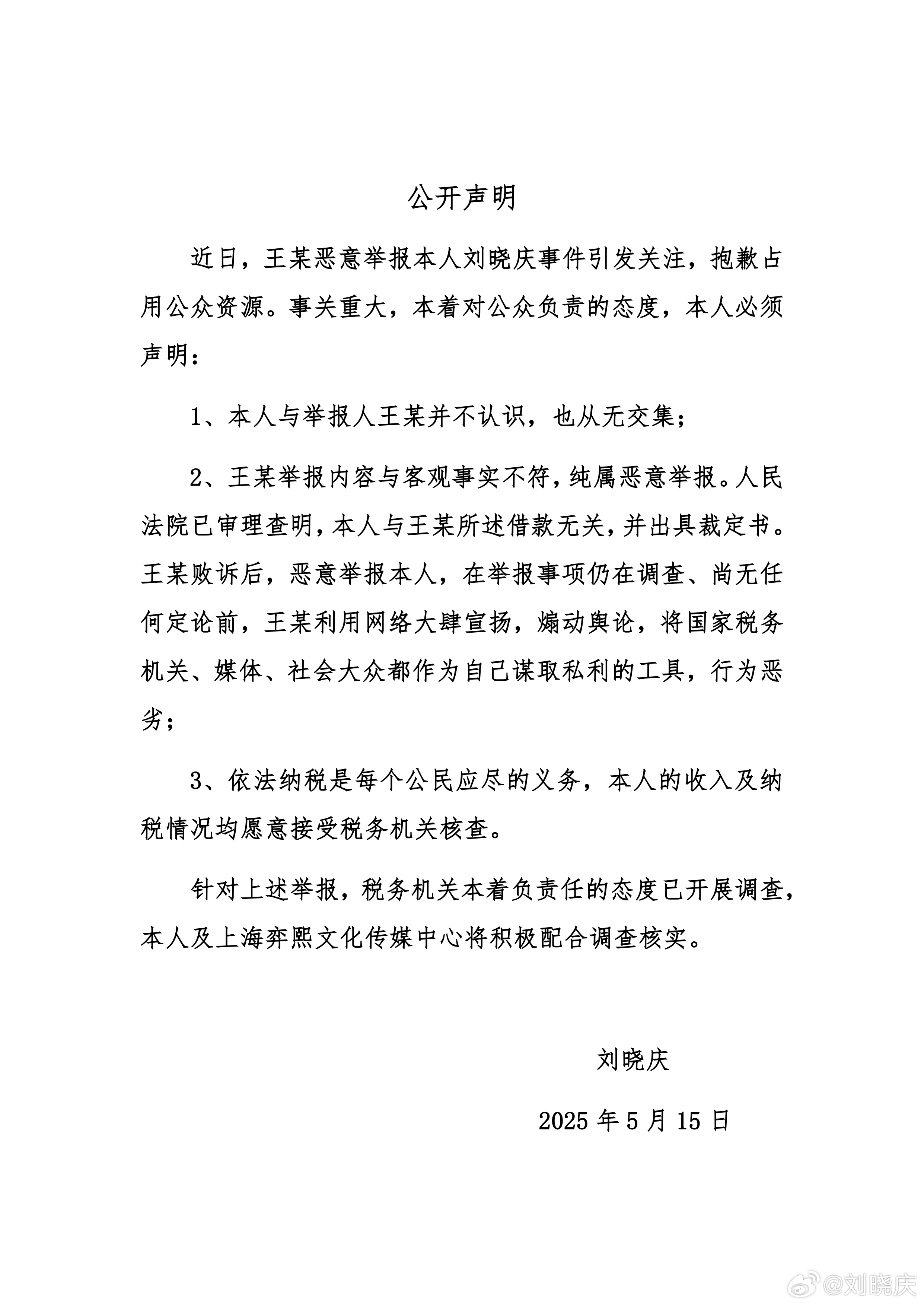 5月15日晚,刘晓庆在社交平台发文,称有关“涉嫌偷税漏税”的举报内容与客观事实不符,与举报人王某并不认识,也从无交集,本人及上海弈熙文化传媒中心将配合税务机关调查核实。